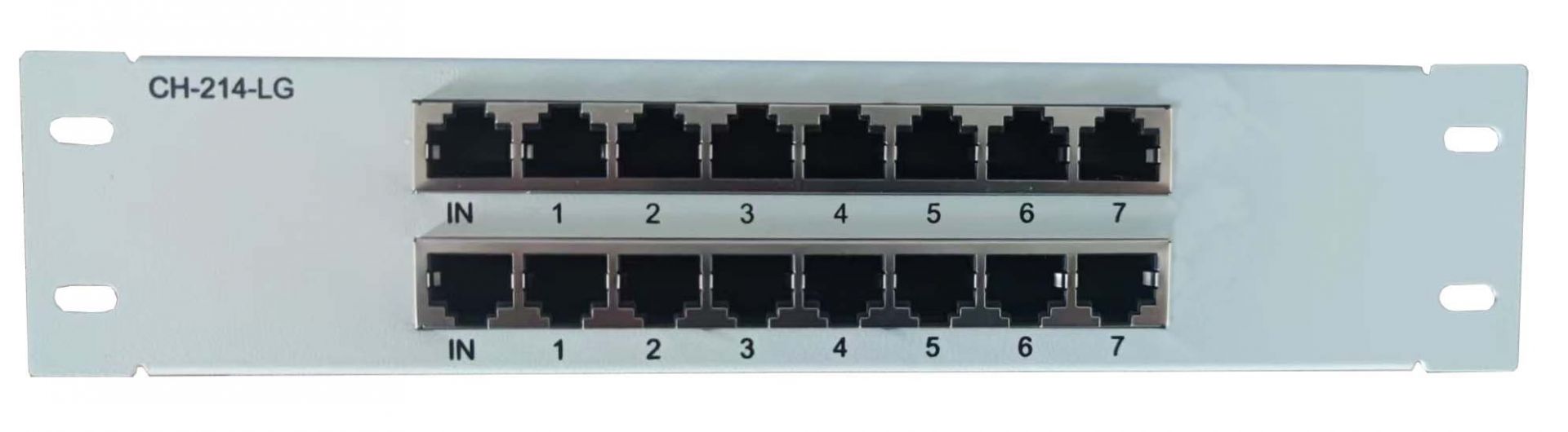 電話訊號分配模組,提供二進十四出配置,採用 RJ45 接線介面。
