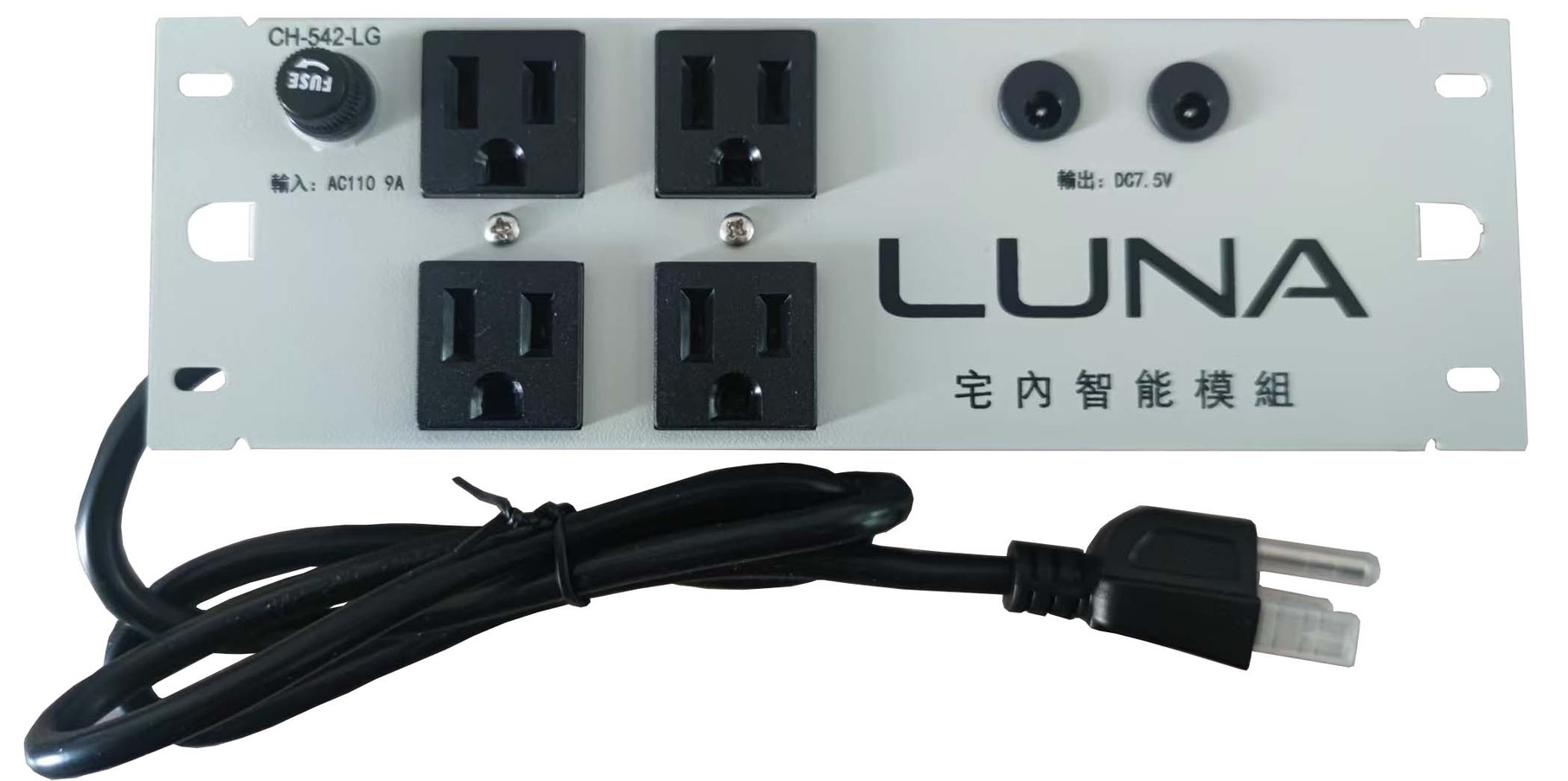 專為住宅弱電箱設計的整合型電源供應模組, 提供四組AC 110V 9A 三插座接地電源和兩組DC 7.5V 10W直流電源之混合輸出配置,集中管理宅內網路與智能設備用電。